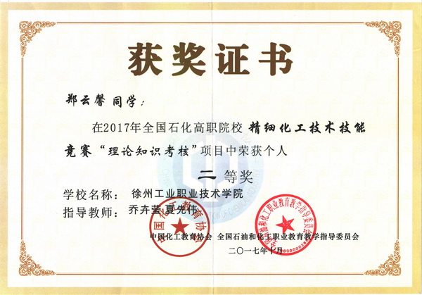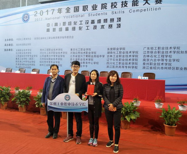 10月25日,由中国化工教育协会、全国石油和化工职业教育教学指导委员会主办,南京科技职业学院承办的2017年全国精细化工技术技能竞赛落下帷幕,来自全国各地的14个参赛队、28名选手参加本次比赛。我校由夏先伟和乔卉莹两位教师指导,化学制药151班刘进杰、郑云馨两位同学组成的参赛团队经过激烈的角逐,荣获团体总分第2名,团体二等奖;在个人独立完成项目“涂料配制及检测考核”中刘进杰获得一等奖,郑云馨获得三等奖;在个人独立完成项目“理论知识考核”中两位同学均取得二等奖。