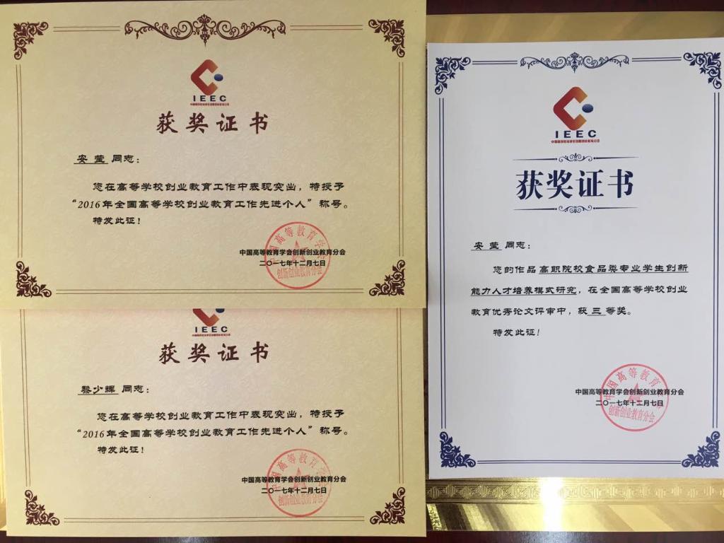 会上,高文兵会长作2016年度学会工作报告。大会还通过2017年新增会员单位名单,宣布了 “深化创新创业教育改革特色典型经验高校”、“全国高等学校创业教育先进个人”、“全国高等学校创业教育优秀论文”等获奖名单,并为获奖代表颁发了奖牌及证书。我校荣获2017年度“全国深化创新创业教育改革特色典型经验高校”称号,黎少辉、安莹两位老师荣获“全国高等学校创业教育工作先进个人”称号,安莹老师撰写的论文《高职院校食品类专业学生创新能力人才培养模式研究》获得全国高等学校创业教育优秀论文三等奖。