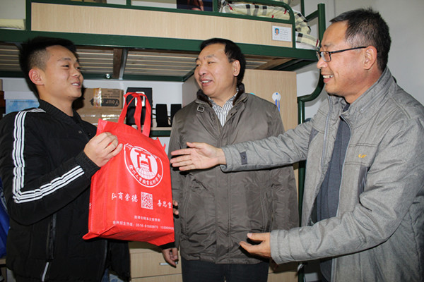 接着,王磊主席、汪明银书记、刘立新副主席在学院老师的陪同下进行了宿舍走访和慰问。走访中,王主席、汪书记详细了解受助学生的学习情况、生活情况,勉励受助学生积极参加学校开展的勤工助学等活动,并亲手将一份份凝结着爱的物品递到同学们的手中。
