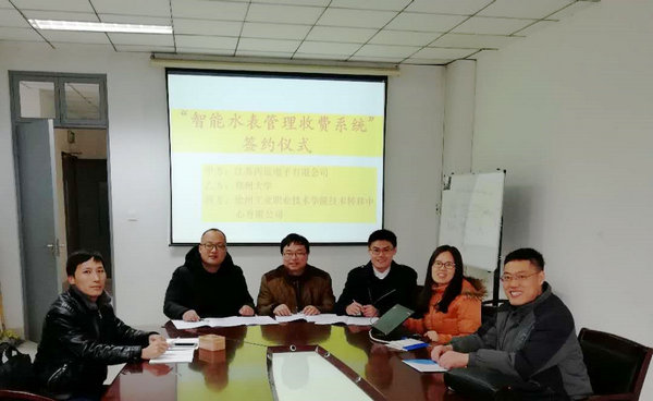 1月30日,我校技术转移中心有限公司协同江苏丙辰电子有限公司赴郑州大学开展技术开发项目“智能水表管理收费系统”合作签约活动。江苏丙辰电子有限公司技术总监柴学勇、工程部部长胡安路,郑州大学信息工程学院软件工程系副主任李晓宇教授、职为梅博士、贾玉祥博士等参加签约仪式。