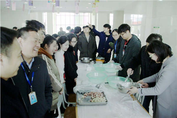 活动现场上空,悬挂着300盏造型各异的灯笼及种类繁多的灯谜,谜题涉及汉字、成语、地名和动物类等,内容丰富,融知识性和趣味性于一体,深受学生的喜爱,大家三三两两聚在一起,互道节日祝福、共同斟酌谜底,其乐融融;大厅西侧是滚元宵与品元宵区域,辅导员老师向学生介绍元宵的由来及元宵与汤圆的区别,并现场示范滚元宵的方法及要领,观摩的学生跃跃欲试,各个摩拳擦掌,在老师的指导下,一盒盒精美的元宵制作而成,滚好的元宵下锅煮熟后,学生门争先恐后的品尝,现场热闹非凡;大厅东侧是花灯制作与绘制区域,一张张五颜六色的纸,经过学生的加工,变成了漂亮的灯笼,喜爱绘画的学生还在灯笼上画出自己喜爱的造型和卡通人物,为节日增添了艺术的气息。