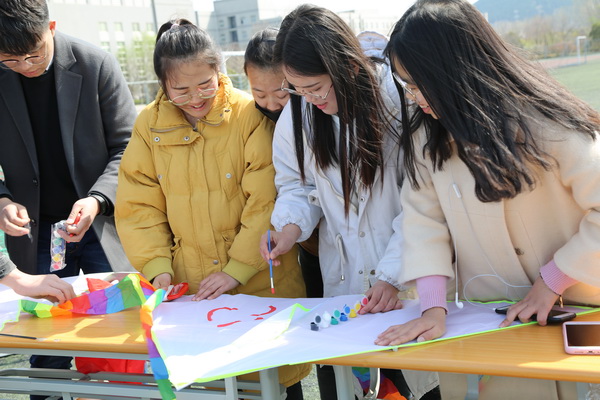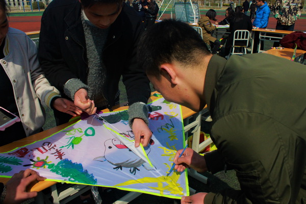 当天下午,以宿舍为单位参加活动同学们带着满满的热情,对放风筝的无限遐想,一起在手绘风筝的过程中大显身手,将自己内心深藏的情感通过绘画一举爆发出来,有的画着充满童趣手掌,有的画着属于自己的卡通人物,有的写着自己的美好愿望,风筝的图案丰富多彩。