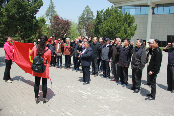 在王杰烈士的墓前,全体党员怀着无比崇敬的心情,站在鲜红的党旗下,庄严的举起右手,隆重举行重温入党誓词仪式。“我志愿加入中国共产党,拥护党的纲领,遵守党的章程……随时准备为党和人民牺牲一切,永不叛党。”铿锵的入党誓词在天地间回荡。支部成员关工委书记王健强说:“享受退休生活的党员重温入党誓词很重要,每个共产党员都要牢记入党时的誓言,时刻用共产党员的标准严格要求自己,活到老学到老干到老,退休不退志,坚定跟党走,永葆革命本色。”
