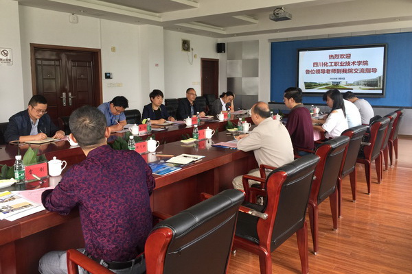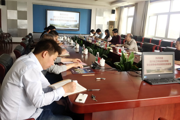 孙院长代表学院对周文处长、张宏主任一行来我校交流表示热烈的欢迎,并做了学院介绍,四川化工职业技术学院继教处周文处长介绍了四川化工职业技术学院。会上,两校主要围绕应用化工技术、高分子材料工程技术专业的学生招生情况、教师师资队伍建设、校外兼职教师管理,校内外实训基地建设、课程体系构建,实训课程、教学资源库、校企合作情况,横向、纵向课题申报情况,对外服务项目情况,技能大赛情况等方面进行了深入的交流和学习,并在会后参观了化学工程学院、材料工程学院、工业过程自动化等专业实训中心。