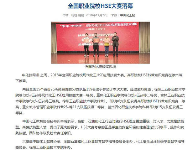 2018年全国职业院校现代化工HSE应用技能大赛、高职院校HSE科普知识竞赛在徐州落下帷幕。