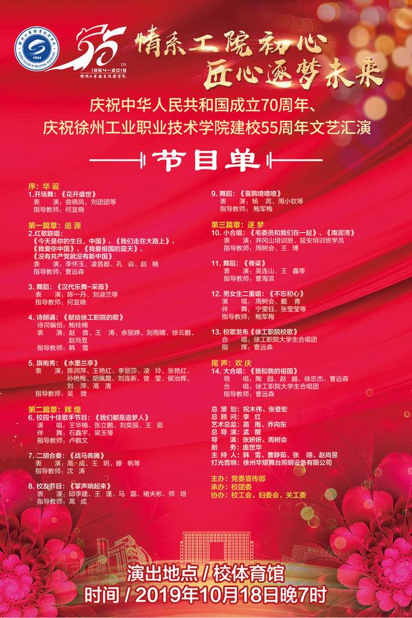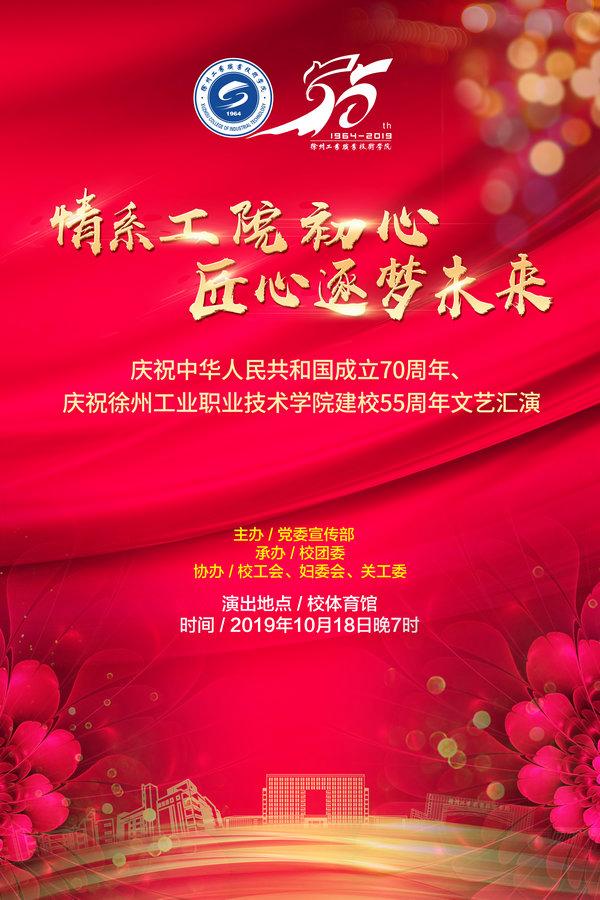 为庆祝我校建校55周年,由宣传部主办,校团委承办,校工会、妇委会、关工委协办的“情系工院初心 匠心筑梦未来——庆祝中华人民共和国成立70周年、庆祝乐鱼官方端网站登录入口建校55周年文艺汇演”将于10月18日晚19点在校体育馆举行,学校将同时进行网络直播,届时欢迎广大师生共同观看演出。