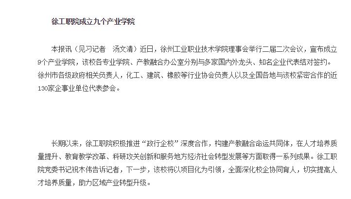 长期以来,徐工职院积极推进“政行企校”深度合作,构建产教融合命运共同体,在人才培养质量提升、教育教学改革、科研攻关创新和服务地方经济社会转型发展等方面取得一系列成果。徐工职院党委书记祝木伟告诉记者,下一步,该校将以项目化为引领,全面深化校企协同育人,切实提高人才培养质量,助力区域产业转型升级。