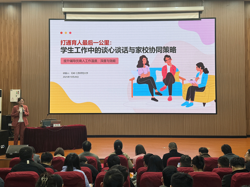 为进一步提升辅导员、班主任育人工作的温度、深度与效能,打通育人“最后一公里”,近日,学工处特邀江苏师范大学卫健办主任石岭老师,开展题为“学生工作中的谈心谈话与家校协同策略”的专题讲座。学工处处长张妍妍、二级学院副书记及全体辅导员、班主任共240余人参与培训,共同探索育人工作的科学方法与实践智慧。活动由学工处副处长秦黎明主持。